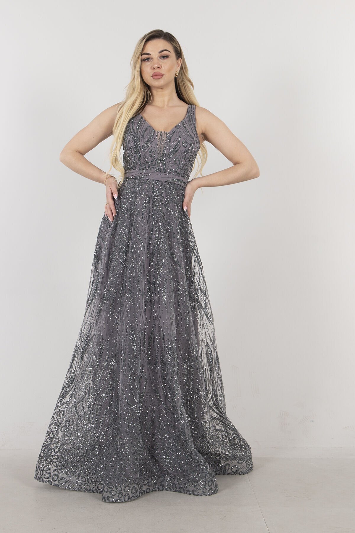 ArdanewlineGri Transparan Detaylı Simli Uzun Abiye Elbise